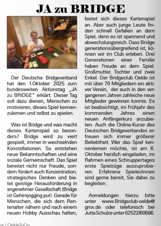 Der Deutsche Bridgeverband hat den 1. Oktober 2025 zum bundesweiten Aktionstag „JA zum Bridge“ erklärt. Dieser Tag soll dazu dienen, Menschen zu motivieren, dieses Spiel kennenzulernen und selbst zu spielen.