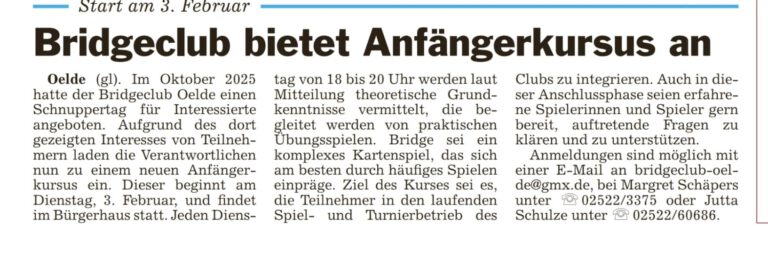 Anmeldungen hierzu bitte unter bridgeclub-oelde@gmx.de oder telefonisch bei Jutta Schulze unter 02522 – 60686.